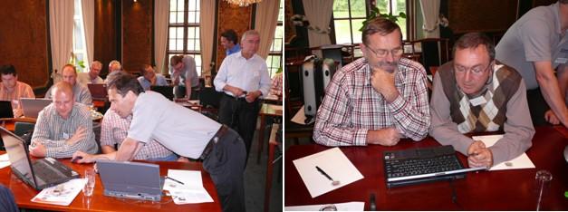 Naľavo Klas vysvetľuje čítanie výstupov v tabuľkách i na grafoch v reálnom čase. Napravo Attila Zoltán a Péter Faludy analyzujú namerané výsledky na workshope 3-4.9.2009.